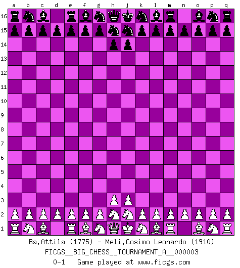 Last move : 0-1 2015 April 22 19:58:26 [Event "FICGS__BIG_CHESS__TOURNAMENT_A__000003"] [Site "FICGS"] [Date "2015.03.23"] [Round "1"] [White "Ba,Attila"] [Black "Meli,Cosimo Leonardo"] [Result "0-1"] [WhiteElo "1775"] [BlackElo "1910"] 0-1 This big chess game has been lost on time (started : 2015.03.23 15:59:18) Follow this game move after move (download)All my games are real. (Bobby Fischer) Ich liebe den Moment, wenn ich das Ego meines Gegenüber breche. (Robert James Fischer) El juego de Fischer siempre fue nítido, racional y brillante. Uno de los mejores por siempre. (Dave Regis) A chaque perte on perd un peu de soi. (Joël Lautier) Methinks King Thibault should dub Marius Zubac a knight of the square board... I mean table, henceforth addressing him as Sir Marius, and bestow on him a suitable land from the kingdom of FICGS & marry him off to a worthy, fair maiden, lest he slice our heads with his mighty sword in his wrath. (Dinesh De Silva)