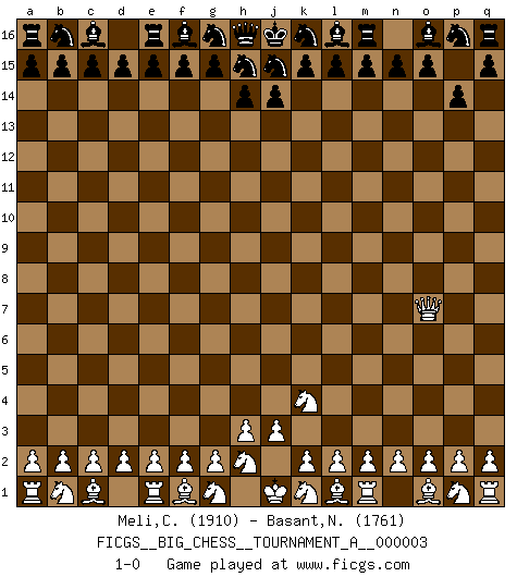 Last move : 1-0 2015 May 4 9:15:33 [Event "FICGS__BIG_CHESS__TOURNAMENT_A__000003"] [Site "FICGS"] [Date "2015.03.23"] [Round "1"] [White "Meli,Cosimo Leonardo"] [Black "Basant,Neel"] [Result "1-0"] [WhiteElo "1910"] [BlackElo "1761"] 1.j2-k4 p15-p14 2.h1-o7 1-0 This big chess game has been lost on time (started : 2015.03.23 15:59:18) Follow this game move after move (download)It's always better to sacrifice your opponent's men. (Savielly Tartakover) Das Schach hält seine Meister in eigenen Banden, Fesseln; auf vielerlei Weise formt es ihren Geist, so dass die innere Freiheit selbst des Stärksten beeinflusst wird. (Albert Einstein) Solo puedes ser bueno en el Ajedrez si amas al juego. (Bobby Fischer) Horreur, mais aussi harmonie suprême : qu'y avait-il en effet au monde en dehors des échecs ? Le brouillard, l'inconnu, le non-être... (Vladimir Nabokov) It's unlucky to be superstitious. (Dave Enteles)