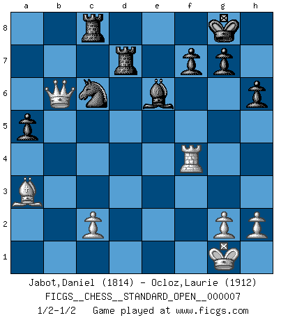 Last move : 1/2-1/2 2015 May 25 12:20:57 [Event "FICGS__CHESS__STANDARD_OPEN__000007"] [Site "FICGS"] [Date "2015.03.24"] [Round "1"] [White "Jabot,Daniel"] [Black "Ocloz,Laurie"] [Result "1/2-1/2"] [WhiteElo "1814"] [BlackElo "1912"] 1.e4 c5 2.Nf3 d6 3.d4 cxd4 4.Nxd4 Nf6 5.Nc3 a6 6.Bg5 e6 7.f4 Qb6 8.Qd2 Qxb2 9.Rb1 Qa3 10.e5 dxe5 11.fxe5 Nfd7 12.Ne4 h6 13.Bh4 Qxa2 14.Rd1 Qd5 15.Qe3 Qxe5 16.Be2 Bc5 17.Bg3 Qd5 18.Bf3 O-O 19.Qc3 a5 20.O-O e5 21.Nf6+ Nxf6 22.Bxd5 Bxd4+ 23.Rxd4 exd4 24.Qxd4 Nxd5 25.Qxd5 Nc6 26.Bd6 Be6 27.Qb5 Rfc8 28.Rf4 Ra6 29.Qxb7 Ra7 30.Qb6 Rd7 31.Ba3 1/2-1/2 Sicilian : Najdorf, 7...Qb6 Kingside Castling by player Black (move 18) Kingside Castling by player White (move 20) This chess game ended in a draw. Follow this game move after move (download)That's what Chess is all about. One day you give your opponent a lesson, the next day he gives you one. (Bobby Fischer) Schach ist Krieg, im Schach geht es um testosterongesteuerte Urschreie. (Garry Kasparov) La vida es como un juego de Ajedrez, cambiando con cada movimiento. (Proverbio Chino) Les Echecs sont affaire de jugement sensible. Savoir quand frapper et quand esquiver. (Fischer) The modern world has divided itself into Conservatives and Progressives. The business of Progressives is to go on making mistakes. The business of the Conservatives is to prevent the mistakes from being corrected. (G.K. Chesterton)