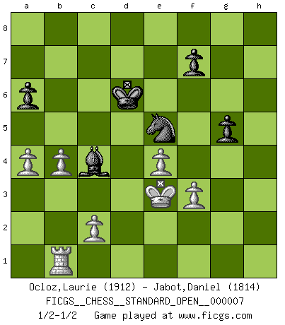 Last move : 1/2-1/2 2015 October 2 19:59:27 [Event "FICGS__CHESS__STANDARD_OPEN__000007"] [Site "FICGS"] [Date "2015.03.24"] [Round "2"] [White "Ocloz,Laurie"] [Black "Jabot,Daniel"] [Result "1/2-1/2"] [WhiteElo "1912"] [BlackElo "1814"] 1.e4 c5 2.Nf3 d6 3.d4 cxd4 4.Nxd4 Nf6 5.Nc3 g6 6.Be3 Bg7 7.f3 O-O 8.Qd2 Nc6 9.O-O-O Bd7 10.g4 Rc8 11.Kb1 Ne5 12.Be2 Nc4 13.Bxc4 Rxc4 14.h4 h5 15.gxh5 Nxh5 16.Rhg1 b5 17.b3 Rc8 18.Ncxb5 e5 19.Nxd6 exd4 20.Bxd4 Qxh4 21.Nxc8 Bxc8 22.Qe3 a6 23.Bxg7 Kxg7 24.Rd6 Qf4 25.Qc3+ Kh7 26.Rgd1 Bh3 27.Rd8 Rxd8 28.Rxd8 Ng7 29.a4 g5 30.Qd2 Qf6 31.Rd3 Ne6 32.Qc3 Kg6 33.Qxf6+ Kxf6 34.b4 Bf1 35.Rd5 Ke7 36.Kc1 Bg2 37.Rd3 Nf4 38.Re3 Bf1 39.Kd2 Ng6 40.Rb3 Bc4 41.Rb1 Ne5 42.Ke3 Kd6 1/2-1/2 Sicilian : Dragon, Yugoslav attack, 7...O-O Kingside Castling by player Black (move 7) Queenside Castling by player White (move 9) This chess game ended in a draw. Follow this game move after move (download)War is the child of passion, passion is the child of narcissism and narcissism is the child. (...) Another game ? (Thibault de Vassal) Ich moechte nie einem Club beitreten, der Leute wie mich als Mitglieder aufnimmt. (Woody Allen) Nada excita más a Grandes Maestros aburridos que una novedad teórica. (Dominic Lawson) Karpov est une pièce de musée. (Garry Kasparov) The greatest con, that he ever pulled... was making you believe... that he is you. (Revolver, movie)