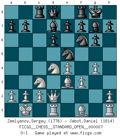 Last move : 0-1 2015 June 19 1:30:38 [Event "FICGS__CHESS__STANDARD_OPEN__000007"] [Site "FICGS"] [Date "2015.03.24"] [Round "1"] [White "Zemlyanov,Sergey"] [Black "Jabot,Daniel"] [Result "0-1"] [WhiteElo "1776"] [BlackElo "1814"] 1.e4 c5 2.Nf3 d6 3.d4 cxd4 4.Nxd4 Nf6 5.Nc3 g6 6.Be3 Bg7 7.f3 O-O 8.Qd2 Nc6 9.O-O-O Bd7 10.g4 Rc8 11.Kb1 Ne5 0-1 Sicilian : Dragon, Yugoslav attack, 7...O-O Kingside Castling by player Black (move 7) Queenside Castling by player White (move 9) Player Black won this chess game. Follow this game move after move (download)When you don't know what to play, wait for an idea to come into your opponent's mind. You may be sure that idea will be wrong. (Siegbert Tarrasch) Ich weiss nicht was Gott gegen mich auf 1.e4 antworten würde. (Robert James Fischer) Bobby Fischer es el jugador de Ajedrez mas grande que jamás haya existido. (Ken Smith) Le pion, dans sa simplicité, marche droit devant lui, mais lorsqu'il prend, il le fait obliquement? Ainsi l'homme, tant qu'il reste pauvre, marche dans la droiture et vit honnêtement, mais lorsqu'il recherche les honneurs, il flatte, se parjure et, par les voies obliques, cherche une position supérieure sur l'échiquier du monde. (Jean de Galles) All art requires courage. (Anne Tucker)