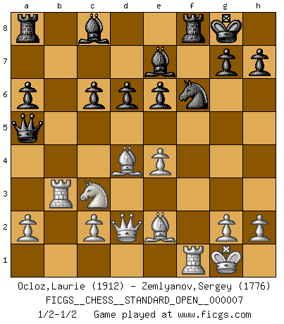 Last move : 1/2-1/2 2015 April 12 2:27:15 [Event "FICGS__CHESS__STANDARD_OPEN__000007"] [Site "FICGS"] [Date "2015.03.24"] [Round "1"] [White "Ocloz,Laurie"] [Black "Zemlyanov,Sergey"] [Result "1/2-1/2"] [WhiteElo "1912"] [BlackElo "1776"] 1.e4 c5 2.Nf3 d6 3.d4 cxd4 4.Nxd4 Nf6 5.Nc3 a6 6.Bg5 e6 7.f4 Qb6 8.Qd2 Qxb2 9.Rb1 Qa3 10.f5 Nc6 11.fxe6 fxe6 12.Nxc6 bxc6 13.Be2 Be7 14.O-O O-O 15.Rb3 Qc5+ 16.Be3 Qe5 17.Bd4 Qa5 1/2-1/2 Sicilian : Najdorf, 7...Qb6 Kingside Castling by player White (move 14) Kingside Castling by player Black (move 14) This chess game ended in a draw. Follow this game move after move (download)Chess is like life. (Boris Spassky) Es tut gut, die Entwicklungsperiode von, [...] demokratischem Geist durchdringen zu lassen. Wie undemokratisch wäre es doch beispielsweise, den einen Offizier große Spaziertouren vornehmen zu lassen, während die anderen zu Hause säßen und sich entsetzlich langweilten. (Aaron Nimzowitsch) El Ajedrez es un expediente tonto que hace creer a la gente inactiva que hacen una cosa muy astuta cuando solamente estan perdiendo su tiempo. (George Bernard Shaw) Nous sommes les pions de la mystérieuse partie d'Echecs jouée par Dieu. Il nous déplace, nous arrête, nous pousse encore, puis nous lance un à un dans la boîte du Néant. Epitaphe sur la tombe de David Janowsky (1868-1927). Computers have lots of memory but no imagination. (Anonymous)