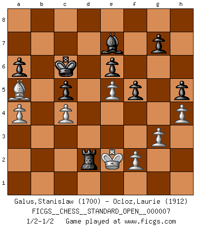 Last move : 1/2-1/2 2015 April 25 21:12:37 [Event "FICGS__CHESS__STANDARD_OPEN__000007"] [Site "FICGS"] [Date "2015.03.24"] [Round "1"] [White "Galus,Stanislaw"] [Black "Ocloz,Laurie"] [Result "1/2-1/2"] [WhiteElo "1700"] [BlackElo "1912"] 1.d4 Nf6 2.c4 e6 3.Nf3 b6 4.g3 Ba6 5.b3 Bb4+ 6.Bd2 Be7 7.Bg2 c6 8.Bc3 d5 9.Nbd2 Nbd7 10.O-O c5 11.e4 Nxe4 12.Nxe4 dxe4 13.Ne5 Nxe5 14.dxe5 Qxd1 15.Raxd1 Bb7 16.Rfe1 Rd8 17.Rxd8+ Kxd8 18.Bxe4 Bxe4 19.Rxe4 a6 20.Kf1 Kc7 21.Ke2 Rf8 22.a4 Kc6 23.Re3 b5 24.Rd3 h5 25.h3 bxc4 26.bxc4 f5 27.Ba5 Rb8 28.h4 Rb2+ 29.Rd2 Rxd2+ 1/2-1/2 Queen's Indian : Nimzovich variation (exaggerated Fianchetto) Kingside Castling by player White (move 10) This chess game ended in a draw. Follow this game move after move (download)The only thing Chess players have in common is Chess. (Lodewijk Prins) Ich bewundere Kasparows phantasievolle Angriffssiege aus den Achtzigern und Neunzigern, aber wenn man sie mit dem Computer überprüft, nimmt der Computer in jeder zweiten Partie die Opfer an, verteidigt sich und gewinnt. (Vladimir Kramnik) Un entendimiento minucioso de las típicas continuaciones de mate hacen de las mas complicadas combinaciones de sacrificio que conducen hacia ellas no solo no dificiles, sino casi un asunto de rutina. (Siegbert Tarrasch) Je ne suis pas le dernier à jouer lâchement des coups douteux pendant le zeïtnot de l'adversaire pour l'achever: en effet les coups qui font le plus peur sont ceux que l'on ne comprend pas. Je me fais souvent peur quand je joue. (Un professeur anonyme) Chess, like love, like music, has the power to make people happy. (Siegbert Tarrasch)