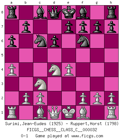 Last move : 0-1 2007 April 17 5:17:12 [Event "FICGS__CHESS__CLASS_C__000032"] [Site "FICGS"] [Date "2007.03.03"] [Round "1"] [White "Surimi,Jean-Eudes"] [Black "Ruppert,Horst"] [Result "0-1"] [WhiteElo "1925"] [BlackElo "1798"] 1.e4 c5 2.Nf3 d6 3.d4 cxd4 4.Nxd4 Nf6 5.Nc3 a6 6.a4 Nc6 0-1 This chess game has been lost on time (started : 2007.03.03 12:43:54) Sicilian : Najdorf Player Black won this chess game. Follow this game move after move (download)Chess is the gymnasium of the mind. (Blaise Pascal) Im Schach gibt es keinen Platz für Galanterie. (Irving Chernev) La señal de un Gran Maestro es su habilidad de ganar una partida rápidamente y sin dolor. (Irving Chernev) L'ordinateur a tué l'originalité. Il n'y a plus guère d'aventures sur l'échiquier. (Jacob Murray) Philosophers use a language that is already deformed as though by shoes that are too tight. (Ludwig Wittgenstein)