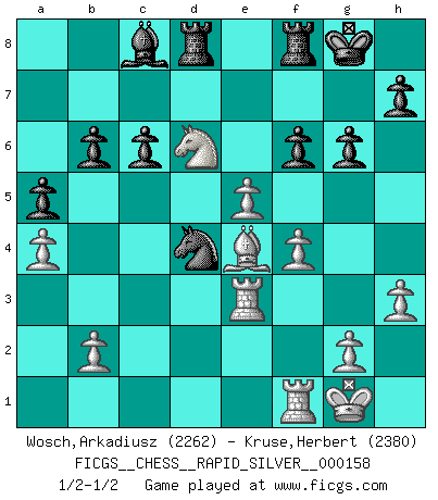 Last move : 1/2-1/2 2015 May 26 7:12:18 [Event "FICGS__CHESS__RAPID_SILVER__000158"] [Site "FICGS"] [Date "2015.03.25"] [Round "2"] [White "Wosch,Arkadiusz"] [Black "Kruse,Herbert"] [Result "1/2-1/2"] [WhiteElo "2262"] [BlackElo "2380"] 1.d4 Nf6 2.c4 c6 3.Nf3 d5 4.Nc3 e6 5.e3 Nbd7 6.Be2 b6 7.O-O Bd6 8.a4 a5 9.Nd2 O-O 10.e4 dxe4 11.Ndxe4 Bb4 12.Nxf6+ Qxf6 13.Be3 Bb7 14.Bf3 Qe7 15.Qb3 Rab8 16.Bf4 e5 17.Rae1 Rbe8 18.dxe5 Qe6 19.Qc2 Nc5 20.Be3 Qxc4 21.Be2 Qb3 22.Qxb3 Nxb3 23.f4 Bc5 24.Bf3 Rd8 25.Ne4 Bxe3+ 26.Rxe3 Nd4 27.Nd6 Bc8 28.Be4 g6 29.h3 f6 1/2-1/2 Queen's pawn game Kingside Castling by player White (move 7) Kingside Castling by player Black (move 9) This chess game ended in a draw. Follow this game move after move (download)Nothing excites jaded Grandmasters more than a theoretical novelty. (Dominic Lawson) Das Schach hält seine Meister in eigenen Banden, Fesseln; auf vielerlei Weise formt es ihren Geist, so dass die innere Freiheit selbst des Stärksten beeinflusst wird. (Albert Einstein) El Ajedrez, como cualquier otra actividad creativa, puede existir solo a través de méritos combinados de aquellos que tienen talento creativo y de aquellos que tienen la habilidad de organizar un trabajo creativo. (Mikhail Botvinnik) Le pion, dans sa simplicité, marche droit devant lui, mais lorsqu'il prend, il le fait obliquement? Ainsi l'homme, tant qu'il reste pauvre, marche dans la droiture et vit honnêtement, mais lorsqu'il recherche les honneurs, il flatte, se parjure et, par les voies obliques, cherche une position supérieure sur l'échiquier du monde. (Jean de Galles) I take risks, sometimes patients die, but not taking risks causes more patients to die. So I guess my biggest problem is I've been cursed with the ability to do the math. (Gregory House, House M.D.)