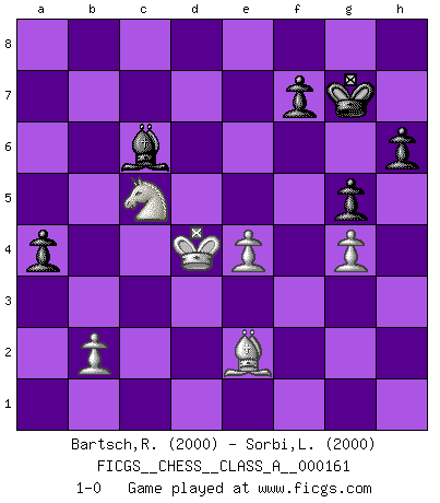 Last move : 1-0 2015 April 27 22:22:5 [Event "FICGS__CHESS__CLASS_A__000161"] [Site "FICGS"] [Date "2015.03.26"] [Round "1"] [White "Bartsch,Reinhard Andrea"] [Black "Sorbi,Luca"] [Result "1-0"] [WhiteElo "2000"] [BlackElo "2000"] 1.d4 Nf6 2.c4 e6 3.Nf3 d5 4.Nc3 c6 5.e3 Nbd7 6.Qc2 Bd6 7.Bd3 O-O 8.O-O dxc4 9.Bxc4 b5 10.Bd3 Bb7 11.Ng5 Bxh2+ 12.Kxh2 Ng4+ 13.Kg1 Qxg5 14.f3 Ngf6 15.e4 Qh4 16.Ne2 a5 17.Bf4 Rfe8 18.Qd2 h6 19.g3 Qh5 20.g4 Qh3 21.Rf2 e5 22.dxe5 Nxe5 23.Bxe5 Rxe5 24.Qf4 Rg5 25.Rh2 Rxg4+ 26.Qxg4 Qxh2+ 27.Kxh2 Nxg4+ 28.fxg4 Kf8 29.Rd1 Rd8 30.Kg3 c5 31.Nc3 b4 32.Bc2 Rxd1 33.Nxd1 c4 34.Kf4 Bc8 35.Ne3 Be6 36.Nd5 g6 37.Bd1 Kg7 38.Ke5 b3 39.axb3 cxb3 40.Nb6 g5 41.Kd4 Kf6 42.Na4 Bd7 43.Nc5 Bc6 44.Bxb3 Ke7 45.Bd1 Kf6 46.Be2 Kg7 47.Nb3 a4 48.Nc5 1-0 Queen's pawn game Kingside Castling by player Black (move 7) Kingside Castling by player White (move 8) Player White won this chess game. Follow this game move after move (download)It is always better to sacrifice your opponent's men. (Savielly Tartakower) Obwohl ich alt bin, darf mir niemand den Finger in den Mund stecken, sonst beisse ich. (Wilhelm Steinitz) Nunca antes ha habido un jugador de Ajedrez con tal conocimiento a fondo de las complejidades del juego y una inmensa voluntad absolutamente indomable de ganar. Yo pienso que Fischer es el jugador mas grande que jamás haya existido. (Lisa Lane) Toutes choses étant égales, c'est la conviction qui gagne. Alliée à une volonté de vaincre, elle sert de détonateur, suscite des idées, disperse les doutes et aide à penser clairement. (Robert Fischer) A good book on your shelf is a friend that turns its back on you and remains a friend. (Author unknown)