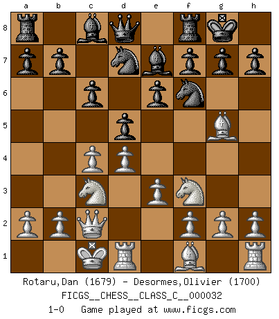 Last move : 1-0 2007 April 14 10:57:17 [Event "FICGS__CHESS__CLASS_C__000032"] [Site "FICGS"] [Date "2007.03.03"] [Round "1"] [White "Rotaru,Dan"] [Black "Desormes,Olivier"] [Result "1-0"] [WhiteElo "1679"] [BlackElo "1700"] 1.d4 d5 2.c4 c6 3.Nf3 e6 4.Qc2 Nf6 5.Bg5 Be7 6.e3 Nbd7 7.Nc3 O-O 8.O-O-O 1-0 This chess game has been lost on time (started : 2007.03.03 12:43:54) QGD Slav : 3.Nf3 Kingside Castling by player Black (move 7) Queenside Castling by player White (move 8) Player White won this chess game. Follow this game move after move (download)I still hope to kill Fischer. (Boris Spassky) Der Umstand, daß uns eine 7 Stunden Zeitkontrolle ermöglicht eine großartige, tiefe Partie zu spielen, ist für die Massenmedien nicht weiter von Bedeutung. (Alexej Shirov) Al jugar al Ajedrez entonces, podemos aprender: Primero: Previsión... Segundo: Prudencia... Tercero: Cautela... Y al final, aprendemos del Ajedrez el hábito de no ser desanimados por apariencias malas presentes en el estado de nuestros asuntos, el hábito de la esperanza por una oportunidad favorable y la perseveración de los secretos de los recursos. (Benjamin Franklin) Il vaut toujours mieux jouer un plan faux de façon logique que de n'avoir pas de plan du tout. (Victor Kortchnoï) Man is still the most extraordinary computer of all. (John F. Kennedy)