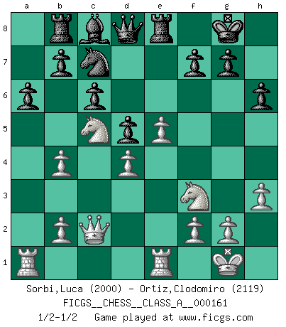 Last move : 1/2-1/2 2015 April 4 14:5:23 [Event "FICGS__CHESS__CLASS_A__000161"] [Site "FICGS"] [Date "2015.03.26"] [Round "1"] [White "Sorbi,Luca"] [Black "Ortiz,Clodomiro"] [Result "1/2-1/2"] [WhiteElo "2000"] [BlackElo "2119"] 1.e4 e5 2.Nf3 Nc6 3.Bc4 Nf6 4.d3 Bc5 5.c3 a6 6.Bb3 d6 7.O-O O-O 8.Re1 Ng4 9.Re2 Ba7 10.h3 Nf6 11.Be3 Na5 12.Bxa7 Nxb3 13.axb3 Rxa7 14.d4 exd4 15.cxd4 d5 16.e5 Ne8 17.Nc3 c6 18.Qc2 Nc7 19.Na4 h6 20.R2e1 Ra8 21.Nc5 Re8 22.Rec1 Rb8 23.b4 Nb5 24.Re1 Nc7 1/2-1/2 Two knights defense (Modern Bishop's Opening) Kingside Castling by player White (move 7) Kingside Castling by player Black (move 7) This chess game ended in a draw. Follow this game move after move (download)Morphy was probably the greatest genius of them all. (Bobby Fischer) Im Reiche der Wirklichkeit ist man nie so glücklich wie im Reiche der Gedanken. (Arthur Schopenhauer) ¿Se han dado cuenta de que Fischer casi nunca ha tenido piezas malas? El las intercambia y las piezas malas se quedan con sus oponenets. (Yuri Balashov) La vérité est comme le meilleur coup aux échecs : elle existe, mais il faut la chercher. (Arturo Perez-Reverte) Opportunities multiply as they are seized. (Sun Tzu)