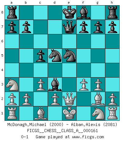 Last move : 0-1 2015 April 9 23:58:5 [Event "FICGS__CHESS__CLASS_A__000161"] [Site "FICGS"] [Date "2015.03.26"] [Round "1"] [White "McDonagh,Michael"] [Black "Alban,Alexis"] [Result "0-1"] [WhiteElo "2000"] [BlackElo "2081"] 1.e4 c5 2.c3 Nf6 3.e5 Nd5 4.g3 d6 5.exd6 Nc6 6.dxe7 Qxe7+ 7.Qe2 Ne5 8.Bg2 Bg4 9.f3 Bf5 10.Na3 Bd3 0-1 Sicilian : Alapin's variation (2.c3) Player Black won this chess game. Follow this game move after move (download)In Chess, as it is played by masters, chance is practically eliminated. (Emanuel Lasker) Ich moechte nie einem Club beitreten, der Leute wie mich als Mitglieder aufnimmt. (Woody Allen) La maestría del Ajedrez consiste esencialmente en analizar posiciónes de Ajedrez con precisión. (Mikhail Botvinnik) Aux échecs, l'amour-propre est satisfait quand on remporte la victoire, mais il n'y a pas de honte à être battu. (Benjamin Franklin) Without enthusiasm, virtue functions not at all, and vice only poorly. (Mignon McLaughlin, The Neurotic's Notebook, 1960)