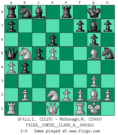 Last move : 1-0 2015 April 2 19:54:27 [Event "FICGS__CHESS__CLASS_A__000161"] [Site "FICGS"] [Date "2015.03.26"] [Round "1"] [White "Ortiz,Clodomiro"] [Black "McDonagh,Michael"] [Result "1-0"] [WhiteElo "2119"] [BlackElo "2000"] 1.d4 e6 2.c4 Nf6 3.g3 c5 4.d5 exd5 5.cxd5 d6 6.Nf3 g6 7.Nc3 Bg7 8.Bg2 O-O 9.O-O Re8 10.Bf4 Nh5 11.Bg5 Qa5 12.Nd2 b5 13.a4 b4 14.Nb5 1-0 Queen's pawn Kingside Castling by player Black (move 8) Kingside Castling by player White (move 9) Player White won this chess game. Follow this game move after move (download)Chess is like war on a board. (Bobby Fischer) Ich hatte Angst gegen einen russischen Großmeister zu verlieren, und er befürchtete gegen einen kleinen Jungen zu verlieren. (über ein Remis gegen Juri Awerbach). (Robert James Fischer) El Ajedrez es el gimnasio de la mente. (Blaise Pascal) Le plus grand jeu de l'esprit jamais inventé, plus vous l'apprenez, plus vous y prenez du plaisir. (Garry Kasparov) Fame, I have already. Now I need the money. (an elderly Steinitz)