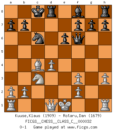 Last move : 0-1 2007 March 11 9:31:35 [Event "FICGS__CHESS__CLASS_C__000032"] [Site "FICGS"] [Date "2007.03.03"] [Round "1"] [White "Kuuse,Klaus"] [Black "Rotaru,Dan"] [Result "0-1"] [WhiteElo "1909"] [BlackElo "1679"] 1.e4 c6 2.d4 d5 3.exd5 cxd5 4.c4 Nf6 5.Nc3 Nc6 6.Nf3 Bg4 7.h3 Bxf3 8.gxf3 e6 9.Bg5 dxc4 10.Bxf6 Qxf6 11.Bxc4 O-O-O 0-1 Caro-Kann : Panov-Botvinnik attack Queenside Castling by player Black (move 11) Player Black won this chess game. Follow this game move after move (download)Some part of a mistake is always correct. (Savielly Tartakover) Ein Schachspiel besteht aus drei Phasen: Die erste, wenn du hofftst den Vorteil zu haben, die zweite, wenn du glaubst einen Vorteil zu haben, und die dritte.... wenn du weißt Du wirst verlieren. (Savielly Grigorievitsch Tartakower) Yo jugué Ajedrez con el y a veces le pude haber ganado solo que siempre devuelve su última jugada y juega la partida de manera diferente. (Mark Twain) 'L'échange des dames est un coup dur pour les deux adversaires...' Un journaliste lors d'une partie du match Spassky-Fischer Coffee just isn't my cup of tea. (Unknown)