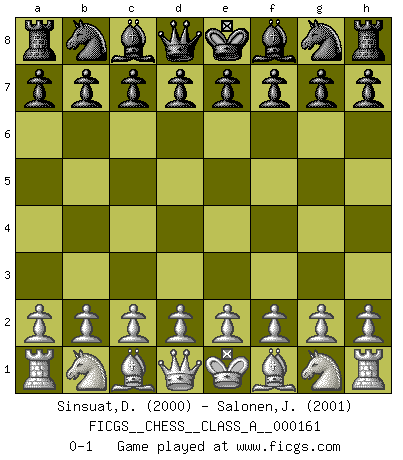 Last move : 0-1 2015 May 5 21:24:24 [Event "FICGS__CHESS__CLASS_A__000161"] [Site "FICGS"] [Date "2015.03.26"] [Round "1"] [White "Sinsuat,Datu Marouf"] [Black "Salonen,Jukka"] [Result "0-1"] [WhiteElo "2000"] [BlackElo "2001"] 0-1 This chess game has been lost on time (started : 2015.03.26 9:37:39) Player Black won this chess game. Follow this game move after move (download)If one piece is badly posted, the whole game is bad. (Tarrasch) Ivan Sokolov treibt mich als Beifahrer an mit go Loeky go - . (Loek van Wely) Los problemas de Ajedrez exigen del compositor las mismas virtudes que caracterizan todo el arte de valor: originalidad, invención, concisión, armonía, complejidad e insinceridad explendida. (Vladimir Nabokov) C'est la seule position que je connaisse où les deux camps sont mals. Propos prêtés à V. Anand. Question: Is 'This statement is paradoxical' a paradoxical statement ? Or is it a meta-paradox ? (Normajean Yates)