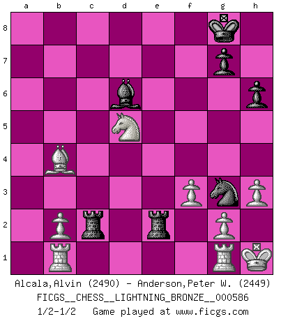 Last move : 1/2-1/2 2015 March 26 17:12:11 [Event "FICGS__CHESS__LIGHTNING_BRONZE__000586"] [Site "FICGS"] [Date "2015.03.26"] [Round "1"] [White "Alcala,Alvin"] [Black "Anderson,Peter W."] [Result "1/2-1/2"] [WhiteElo "2490"] [BlackElo "2449"] 1.d4 d5 2.c4 e6 3.Nc3 c5 4.cxd5 cxd4 5.Qa4+ Bd7 6.Qxd4 exd5 7.Qxd5 Nc6 8.Nf3 Nf6 9.Qb3 Be6 10.Qc2 Rc8 11.e3 Bd6 12.Be2 O-O 13.O-O Qe7 14.h3 a6 15.e4 b5 16.a3 Ne5 17.Nd4 Nc4 18.Rd1 Bb8 19.Kh1 Rfd8 20.Bg5 Re8 21.Bh4 Be5 22.Bxc4 Rxc4 23.Nxe6 Qxe6 24.f3 Rec8 25.Rac1 Bf4 26.Rb1 h6 27.Qd3 Bb8 28.Be1 Nh5 29.Qe3 Bf4 30.Qf2 Ng3+ 31.Kg1 f5 32.exf5 Nxf5 33.Qe2 Qxe2 34.Nxe2 Be3+ 35.Kh1 Rc2 36.Nc3 Bf4 37.Nd5 Bd6 38.Nb4 Re2 39.Bc3 a5 40.Nd5 b4 41.axb4 axb4 42.Bxb4 Ng3+ 43.Kh2 R8c2 44.Rg1 Nf1+ 45.Kh1 Ng3+ 1/2-1/2 QGD : Tarrasch, von Hennig-Schara gambit Kingside Castling by player Black (move 12) Kingside Castling by player White (move 13) This chess game ended in a draw. Follow this game move after move (download)The boy (then a 12 year old boy named Anatoly Karpov) doesn't have a clue about Chess, and there's no future at all for him in this profession. (Mikhail Botvinnik) Jeder Fehler erscheint unglaublich dumm, wenn andre ihn begehen. (Georg Christoph Lichtenberg) Coloca el contenido del tablero de Ajedrez en un sombrero, agita las piezas vigorosamente, derrámalas en el tablero desde una altura de medio metro y así obtienes el estilo de Wilhelm Steinitz. (H. E. Bird) On n'a jamais que l'âge auquel on a commence à jouer aux échecs car après on cesse de vieillir. (Capablanca) Beep ! (R2D2 in Star Wars ep.3)