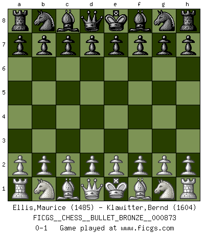 Last move : 0-1 2015 March 28 15:5:58 [Event "FICGS__CHESS__BULLET_BRONZE__000873"] [Site "FICGS"] [Date "2015.03.28"] [Round "1"] [White "Ellis,Maurice"] [Black "Klawitter,Bernd"] [Result "0-1"] [WhiteElo "1485"] [BlackElo "1604"] 0-1 This chess game has been lost on time (started : 2015.03.28 3:32:54) Player Black won this chess game. Follow this game move after move (download)Fischer, who may or may not be mad as a hatter, has every right to be horrified. (Jeremy Silman) Ich spiele ehrlich und spiele, um zu gewinnen. Wenn ich verliere nehme ich meine Medizin. (Robert James Fischer) El Ajedrez detiene a su maestro dentro de sus propios vínculos, encadenando la mente y el cerebro, por lo que la libertad interior del mas fuerte debe sufrir. (Albert Einstein) La menace est plus forte que l'exécution. (Aaron Nimzovitch) Mandala - that's it! 16x16 squares as multiple of the four and the eight because of the Four Noble Truths and the Noble Eightfold Path. (Heinz-Georg Lehnhoff about Big Chess)