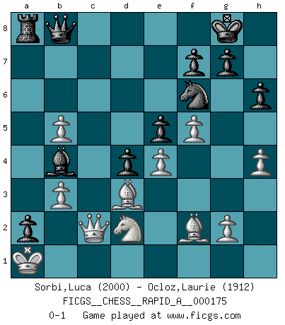 Last move : 0-1 2015 May 5 21:7:22 [Event "FICGS__CHESS__RAPID_A__000175"] [Site "FICGS"] [Date "2015.03.28"] [Round "1"] [White "Sorbi,Luca"] [Black "Ocloz,Laurie"] [Result "0-1"] [WhiteElo "2000"] [BlackElo "1912"] 1.e4 c5 2.Nf3 d6 3.d4 cxd4 4.Nxd4 Nf6 5.Nc3 a6 6.Bg5 e6 7.f4 Qb6 8.Nb3 Be7 9.Qf3 Nbd7 10.O-O-O Qc7 11.Bd3 b5 12.a3 Rb8 13.Rhe1 b4 14.axb4 Rxb4 15.Kb1 h6 16.Bh4 O-O 17.Na2 Rb8 18.Qe2 e5 19.f5 Bb7 20.Nc3 Rfc8 21.Bf2 Ra8 22.h4 a5 23.Nb5 Qb8 24.Nd2 Ba6 25.c4 a4 26.Rc1 a3 27.b3 Bxb5 28.cxb5 a2+ 29.Ka1 d5 30.Rc6 d4 31.Rec1 Rxc6 32.Rxc6 Bb4 33.Nf3 Nc5 34.Rxc5 Bxc5 35.Qc2 Ba3 36.Nd2 Bb4 0-1 Sicilian : Najdorf, 7...Qb6 Queenside Castling by player White (move 10) Kingside Castling by player Black (move 16) Player Black won this chess game. Follow this game move after move (download)All that matters on the Chessboard is good moves. (Bobby Fischer) Wer nie einen Fehler gemacht hat, hat nie etwas Neues ausprobiert. (Albert Einstein) Las Aperturas te enseñan aperturas. ¡Los Finales te enseñan Ajedrez!. (Stephan Gerzadowicz) Le plus grand jeu de l'esprit jamais inventé, plus vous l'apprenez, plus vous y prenez du plaisir. (Garry Kasparov) How many people work in NATO Headquarters ? - About half of them. (Dirk Stikker, NATO general secretary)