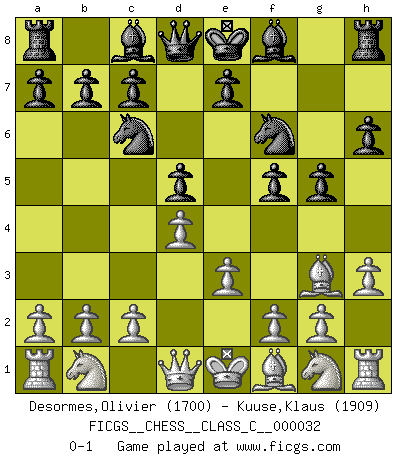 Last move : 0-1 2007 April 21 12:0:23 [Event "FICGS__CHESS__CLASS_C__000032"] [Site "FICGS"] [Date "2007.03.03"] [Round "1"] [White "Desormes,Olivier"] [Black "Kuuse,Klaus"] [Result "0-1"] [WhiteElo "1700"] [BlackElo "1909"] 1.d4 f5 2.Bg5 h6 3.Bh4 g5 4.Bg3 Nf6 5.e3 d5 6.h3 Nc6 0-1 This chess game has been lost on time (started : 2007.03.03 12:43:54) Dutch, 2.Bg5 variation Player Black won this chess game. Follow this game move after move (download)By the beauty of his games, the clarity of his play, and the brilliance of his ideas, Fischer made himself an artist of the same stature as Brahms, Rembrandt, and Shakespeare. (David Levy) Mein Name ist Rustam Kamsky. Sie haben meinen Sohn belästigt. Bereiten Sie sich aufs Sterben vor. (Rustam Kamsky) Yo considero que Fischer es uno de los expertos mas grandes de aperturas de siempre. (Keith Hayward) Toute estimation doit être constamment réévaluée. (Jacob Estrin) Tree pose grows confidence. It roots me to this world. (Terri Guillemets)