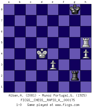 Last move : 1-0 2015 July 19 2:21:51 [Event "FICGS__CHESS__RAPID_A__000175"] [Site "FICGS"] [Date "2015.03.28"] [Round "1"] [White "Alban,Alexis"] [Black "Munoz Portugal,Guillermo"] [Result "1-0"] [WhiteElo "2081"] [BlackElo "1925"] 1.d4 d5 2.c4 e6 3.Nc3 Nf6 4.cxd5 exd5 5.Bg5 Be7 6.e3 h6 7.Bh4 c6 8.Bd3 Ne4 9.Bxe7 Qxe7 10.Bxe4 dxe4 11.Qc2 f5 12.Nge2 Be6 13.d5 Bf7 14.Nd4 Qd7 15.O-O O-O 16.dxc6 Nxc6 17.Nxc6 Qxc6 18.Rfd1 Kh7 19.Rd4 Rad8 20.Rad1 Rxd4 21.Rxd4 Bxa2 22.Qa4 Be6 23.Qxa7 Rf7 24.h4 Bc4 25.Rd8 Rd7 26.Rf8 Rf7 27.Rb8 Qa6 28.Qd4 Qa1 29.Kh2 Qxb2 30.Kg3 Be2 31.Rc8 Bg4 32.Qe5 h5 33.Re8 b6 34.Nd5 Qxe5 35.Rxe5 Be2 36.Kf4 Rb7 37.Rxf5 b5 38.Nb4 g6 39.Re5 Bf1 40.Kg3 Bd3 41.f3 Kg7 42.Re6 Rd7 43.Rb6 Kh6 44.Na6 Rd5 45.Nc7 Rf5 46.f4 Kg7 47.Ne6+ Kf7 48.Nd4 Rc5 49.f5 gxf5 50.Kf4 Bc4 51.Nxf5 Ke8 52.Rg6 Be2 53.Rg8+ Kf7 54.Rg7+ Kf8 55.Rb7 Kg8 56.Kxe4 Bd3 57.Kxd3 Rxf5 58.Kd4 Rf2 59.Rxb5 Rxg2 60.Rxh5 1-0 QGD : Exchange, positional line Kingside Castling by player White (move 15) Kingside Castling by player Black (move 15) 10 pieces endgame at move 57 : White KRNPPP , Black KRPP WHITE : King + 1 Rook 1 Knight 3 Pawns BLACK : King + 1 Rook 2 Pawns 9 pieces endgame at move 57 : White KRPPP , Black KRPP WHITE : King + 1 Rook 3 Pawns BLACK : King + 1 Rook 2 Pawns 8 pieces endgame at move 59 : White KRPPP , Black KRP WHITE : King + 1 Rook 3 Pawns BLACK : King + 1 Rook 1 Pawn 7 pieces endgame at move 59 : White KRPP , Black KRP WHITE : King + 1 Rook 2 Pawns BLACK : King + 1 Rook 1 Pawn 6 pieces endgame at move 60 : White KRPP , Black KR WHITE : King + 1 Rook 2 Pawns BLACK : King + 1 Rook Player White won this chess game. Follow this game move after move (download)Before the endgame, the Gods have placed the middle game. (Siegbert Tarrasch) Um dein Spiel zu verbessern musst du zuallererst das Endspiel studieren, denn diese kann unabhängig studiert werden. Die Eröffnung und das Mittelspiel müssen immer in Bezug gesetzt werden zum Endspiel. (José Raúl Capablanca) Fischer es una tragedia del Ajedrez Americano a la par con Morphy y Pillsbury. (Mig Greengard) Dieu déplace le joueur, et celui-ci la pièce. Quel Dieu derrière Dieu commence donc la trame ? Arturo Perez-Reverte (prix de littérature policière 1993). Only sick music makes money today. (Friedrich Nietzsche)