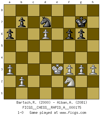 Last move : 1-0 2015 May 6 20:20:0 [Event "FICGS__CHESS__RAPID_A__000175"] [Site "FICGS"] [Date "2015.03.28"] [Round "1"] [White "Bartsch,Reinhard Andrea"] [Black "Alban,Alexis"] [Result "1-0"] [WhiteElo "2000"] [BlackElo "2081"] 1.d4 e5 2.dxe5 Nc6 3.Nf3 d6 4.Bg5 Be7 5.Bxe7 Qxe7 6.exd6 cxd6 7.e3 Be6 8.Bd3 Nf6 9.Nbd2 Rc8 10.O-O O-O 11.c3 Rfe8 12.Qa4 h6 13.Rfd1 d5 14.h3 Qc7 15.Rac1 Na5 16.Nd4 Bd7 17.Qc2 Nc4 18.Nxc4 dxc4 19.Bf5 a6 20.Nf3 Bxf5 21.Qxf5 Rcd8 22.Rd4 Qb6 23.Qc2 Rxd4 24.cxd4 Rc8 25.e4 Re8 26.Re1 Qb5 27.a3 Qc6 28.Ne5 Qc8 29.Qxc4 Qxc4 30.Nxc4 Rxe4 31.Rxe4 Nxe4 32.f3 Nf6 33.Kf2 Nd5 34.g3 Kf8 35.Ne3 Nf6 36.Nf5 Nd5 37.Ke2 g6 38.Ne3 Nf6 39.Ng4 Nh5 40.Kf2 Kg7 41.d5 Kf8 42.Nxh6 Nf6 43.d6 Kg7 44.Ng4 Nd7 45.Ke3 f6 46.Nf2 1-0 Queen's pawn : Charlick (Englund) gambit Kingside Castling by player White (move 10) Kingside Castling by player Black (move 10) Player White won this chess game. Follow this game move after move (download)Capture of the adverse King is the ultimate but not the first object of the game. (William Steinitz) Schach ist Kampf, hauptsächlich jedoch gegen die eigenen Fehler. (Savielly Grigorievitsch Tartakower) Cuando estes solo, cuando te sientas un extraño en el mundo, juega al Ajedrez. Esto levantará tu espiritu y será tu consejero de guerra. (Aristóteles) Les Echecs sont et restent toujours un combat, un combat intégral comme la boxe, la lutte ou un autre sport, et où il doit y avoir un vainqueur et un vaincu. (Joseph Emil Diemer) 98% of all statistics are made up. (Author unknown)