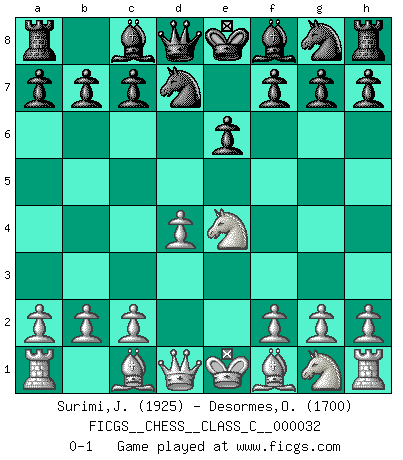 Last move : 0-1 2007 April 25 18:41:4 [Event "FICGS__CHESS__CLASS_C__000032"] [Site "FICGS"] [Date "2007.03.03"] [Round "1"] [White "Surimi,Jean-Eudes"] [Black "Desormes,Olivier"] [Result "0-1"] [WhiteElo "1925"] [BlackElo "1700"] 1.e4 e6 2.d4 d5 3.Nd2 dxe4 4.Nxe4 Nd7 0-1 This chess game has been lost on time (started : 2007.03.03 12:43:54) French : Tarrasch Player Black won this chess game. Follow this game move after move (download)No one ever won a game by resigning. (Unknown) Es ist nicht das erste mal, dass sich die FIDE dem Arabischen Geld gebeugt hat (über die FIDE WM 2004 in Lybien). (Larry Evans) No es tiempo de jugar al Ajedrez cuando la casa esta en llamas. (Proverbio Italiano) Les sacrifices démontrent seulement que quelqu'un a gaffé. (Savielly Tartacover) Those who make the worst use of their time are the first to complain of its brevity. (Jean de la Bruyere)