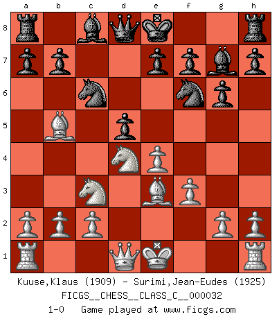 Last move : 1-0 2007 April 17 5:17:12 [Event "FICGS__CHESS__CLASS_C__000032"] [Site "FICGS"] [Date "2007.03.03"] [Round "1"] [White "Kuuse,Klaus"] [Black "Surimi,Jean-Eudes"] [Result "1-0"] [WhiteElo "1909"] [BlackElo "1925"] 1.e4 c5 2.Nf3 Nc6 3.d4 cxd4 4.Nxd4 g6 5.Nc3 Bg7 6.Be3 Nf6 7.f3 d5 8.Bb5 1-0 This chess game has been lost on time (started : 2007.03.03 12:43:54) Sicilian : Accelerated Fianchetto, Modern variation Player White won this chess game. Follow this game move after move (download)You may learn much more from a game you lose than from a game you win. You will have to lose hundreds of games before becoming a good player. (Jose Raul Capablanca) Offener Brief an US-Präsident Bush anlässlich der Verhaftung Bobby Fishers: Verhaften Sie mich. Stecken Sie mich in dieselbe Zelle wie Bobby Fisher und geben Sie uns ein Schachspiel mit. (Boris Vassilievich Spassky) Existen dos clases de sacrificios: los correctos y los míos. (Mikhail Tal) Le succès, c'est être capable d'aller d'échec en échec sans perdre son enthousiasme. (Winston Churchill) That's absurd. I love it. (Gregory House, House M.D.)