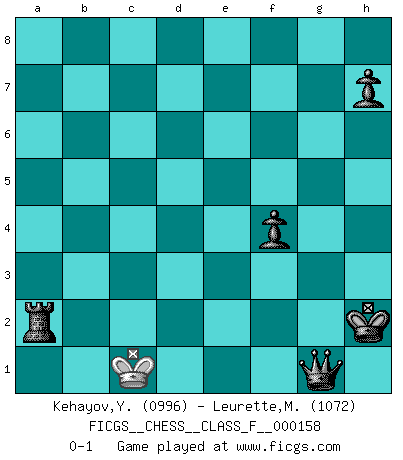Last move : 0-1 2015 May 29 19:26:34 [Event "FICGS__CHESS__CLASS_F__000158"] [Site "FICGS"] [Date "2015.04.02"] [Round "1"] [White "Kehayov,Yulian"] [Black "Leurette,Marc-Antoine"] [Result "0-1"] [WhiteElo "0996"] [BlackElo "1072"] 1.e4 e5 2.Nf3 Nc6 3.d4 exd4 4.Nxd4 Bc5 5.Be2 Nxd4 6.O-O Nf6 7.h3 d6 8.c3 Nc6 9.b4 Bb6 10.Na3 a6 11.Nc4 Be6 12.Nxb6 cxb6 13.Bf4 Nxe4 14.Bf3 Nxc3 15.Qc2 Qf6 16.Bxd6 Nd4 17.Qxc3 Nb5 18.Qd3 Nxd6 19.Qxd6 b5 20.Bxb7 Rd8 21.Qxa6 O-O 22.Bf3 Bc4 23.Qxf6 gxf6 24.Rfe1 Rd2 25.a4 bxa4 26.Rxa4 Rfd8 27.Ra5 Rb2 28.b5 Bxb5 29.R5a1 R8d2 30.Ra8+ Kg7 31.R1e8 Bxe8 32.Rxe8 Rb1+ 33.Kh2 Rxf2 34.Re4 Rb3 35.Rg4+ Kh6 36.h4 Rbxf3 37.Rg3 Rxg3 38.Kxg3 Ra2 39.Kh3 f5 40.g4 Ra3+ 41.Kg2 fxg4 42.h5 Kxh5 43.Kf2 f5 44.Kg2 f4 45.Kf2 g3+ 46.Kg2 Kh4 47.Kg1 Ra2 48.Kf1 Kh3 49.Ke1 Kh2 50.Kd1 g2 51.Kc1 g1Q+ 0-1 Scotch game Kingside Castling by player White (move 6) Kingside Castling by player Black (move 21) 10 pieces endgame at move 36 : White KRPP , Black KRRPPP WHITE : King + 1 Rook 2 Pawns BLACK : King + 2 Rooks 3 Pawns 9 pieces endgame at move 37 : White KPP , Black KRRPPP WHITE : King + 2 Pawns BLACK : King + 2 Rooks 3 Pawns 8 pieces endgame at move 38 : White KPP , Black KRPPP WHITE : King + 2 Pawns BLACK : King + 1 Rook 3 Pawns 7 pieces endgame at move 41 : White KP , Black KRPPP WHITE : King + 1 Pawn BLACK : King + 1 Rook 3 Pawns 6 pieces endgame at move 42 : White K , Black KRPPP WHITE : King + BLACK : King + 1 Rook 3 Pawns Promotion Queen by player Black (move 51) Player Black won this chess game. Follow this game move after move (download)A bad plan is better than none at all. (Frank Marshall) Dein Körper muss in Topform sein. Dein Schach verfällt, wenn dein Körper verfällt. Der Körper kann nicht vom Geist getrennt werden. (Robert James Fischer) La partida mas dura de ganar es una partida ganada. (Emanuel Lasker) 'L'échange des dames est un coup dur pour les deux adversaires...' Un journaliste lors d'une partie du match Spassky-Fischer Children in the dark cause accidents, accidents in the dark cause children. (Unknown)