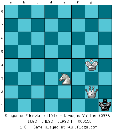Last move : 1-0 2015 June 19 19:12:56 [Event "FICGS__CHESS__CLASS_F__000158"] [Site "FICGS"] [Date "2015.04.02"] [Round "1"] [White "Stoyanov,Zdravko"] [Black "Kehayov,Yulian"] [Result "1-0"] [WhiteElo "1104"] [BlackElo "0996"] 1.e4 e5 2.Nf3 d6 3.h3 Nf6 4.c3 Be7 5.a3 O-O 6.d3 Nbd7 7.Be2 c6 8.Be3 d5 9.exd5 cxd5 10.O-O e4 11.dxe4 dxe4 12.Nfd2 h6 13.Re1 Ne5 14.b4 b6 15.Bb5 a6 16.Be2 b5 17.a4 Bb7 18.axb5 axb5 19.Rxa8 Bxa8 20.Bxb5 Bc6 21.Qa4 Bxb5 22.Qxb5 Ng6 23.Bc5 Bxc5 24.Qxc5 Re8 25.b5 Qc8 26.Qa7 Nd5 27.Qd4 Nf6 28.Nxe4 Nxe4 29.Rxe4 Rxe4 30.Qxe4 Qc5 31.c4 f6 32.Qxg6 Qxc4 33.Kh2 Qxb5 34.f3 Qe5+ 35.Qg3 Qxg3+ 36.Kxg3 Kf7 37.Kg4 g6 38.Nc3 f5+ 39.Kf4 Kf6 40.Nd5+ Ke6 41.g4 fxg4 42.Nc7+ Kf6 43.Kxg4 Ke5 44.f4+ Kf6 45.Nd5+ Ke6 46.Nc7+ Kf6 47.h4 Kf7 48.h5 gxh5+ 49.Kxh5 Kf6 50.Nd5+ Kg7 51.f5 Kh7 52.f6 Kg8 53.Kxh6 Kf7 54.Kh7 Kf8 55.Kg6 Kg8 56.f7+ Kf8 57.Nc7 Ke7 58.Kg7 Kd7 59.Nd5 Ke6 60.Nf4+ Ke7 61.f8Q+ Kd7 62.Nd5 Kc6 63.Qd8 Kc5 64.Kf6 Kd4 65.Ke6 Ke4 66.Qh4+ Kd3 67.Ke5 Kc2 68.Qg3 Kd2 69.Kd4 Kc2 70.Nb4+ Kd2 71.Qd3+ Ke1 72.Nc2+ Kf2 73.Ke4 Kg2 74.Kf4 Kh2 75.Kg4 Kg2 76.Qe2+ Kg1 77.Ne3 Kh1 78.Qg2+ 1-0 Philidor's defense Kingside Castling by player Black (move 5) Kingside Castling by player White (move 10) 10 pieces endgame at move 35 : White KNPPP , Black KQPPP WHITE : King + 1 Knight 3 Pawns BLACK : King + 1 Queen 3 Pawns 9 pieces endgame at move 36 : White KNPPP , Black KPPP WHITE : King + 1 Knight 3 Pawns BLACK : King + 3 Pawns 8 pieces endgame at move 41 : White KNPP , Black KPPP WHITE : King + 1 Knight 2 Pawns BLACK : King + 3 Pawns 7 pieces endgame at move 43 : White KNPP , Black KPP WHITE : King + 1 Knight 2 Pawns BLACK : King + 2 Pawns 6 pieces endgame at move 48 : White KNP , Black KPP WHITE : King + 1 Knight 1 Pawn BLACK : King + 2 Pawns 5 pieces endgame at move 49 : White KNP , Black KP WHITE : King + 1 Knight 1 Pawn BLACK : King + 1 Pawn 4 pieces endgame at move 53 : White KNP , Black K WHITE : King + 1 Knight 1 Pawn BLACK : King + Promotion Queen by player White (move 61) Player White won this chess game. Follow this game move after move (download)It is always better to sacrifice your opponent's men. (Savielly Tartakower) Die Elozahlen sind sehr schlecht für das Schach. Jetzt ist Schach eine Sportindustrie, die darauf zielt Elopunkte zu machen. (Miguel Najdorf) Yo creo que el Ajedrez posee una magia que es también una ayuda en la edad avanzada. Una rodilla reumática es olvidada durante una partida de Ajedrez y otros eventos pueden parecer algo sin importancia comparada a una catástrofe en el tablero de Ajedrez. (Vlastimil Hort) Votre prénom est 'Tactique', votre deuxième prénom est 'Tactique' et votre nom est 'Tactique'. (Ken Smith) The Internet is so big, so powerful and pointless that for some people it is a complete substitute for life. (Andrew Brown)
