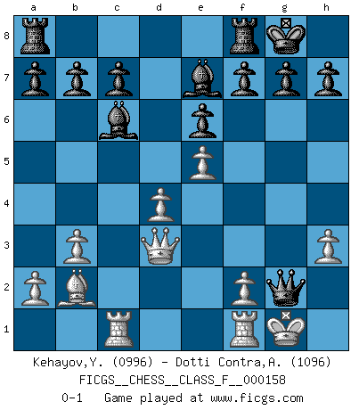 Last move : 0-1 2015 May 20 16:52:41 [Event "FICGS__CHESS__CLASS_F__000158"] [Site "FICGS"] [Date "2015.04.02"] [Round "1"] [White "Kehayov,Yulian"] [Black "Dotti Contra,Alessandro"] [Result "0-1"] [WhiteElo "0996"] [BlackElo "1096"] 1.d4 d5 2.c4 e6 3.c5 Nc6 4.Nf3 Nf6 5.Nc3 Be7 6.e3 O-O 7.Be2 Ne4 8.Nxe4 dxe4 9.Ne5 Nxe5 10.O-O Nd3 11.Bxd3 exd3 12.Qxd3 Bxc5 13.b3 Bd6 14.e4 Bd7 15.e5 Be7 16.Bb2 Bc6 17.h3 Qd5 18.Rac1 Qxg2+ 0-1 Queen's gambit declined Kingside Castling by player Black (move 6) Kingside Castling by player White (move 10) Player Black won this chess game. Follow this game move after move (download)Pawns are born free, yet they are everywhere in chains. (Rick Kennedy) Obwohl ich vom Stil her kaum zu den Priestern der Schachkunst gezählt werde, halte ich Schach doch für eine Kunst. (Tigran Petrosjan) Botvinnik trataba de restarle el misterio al Ajedrez, siempre relacionandolo a situaciones de la vida ordinaria. El gustaba de llamar al Ajedrez un típico problema inexacto similar a aquellos de los cuales la gente siempre tiene que enfrentarse en la vida cotidiana. (Garry Kasparov) Aucun coup ne doit être joué sans but. (Pedro Damiano) The mind is like a parachute, it only functions when its open. (Unknown)