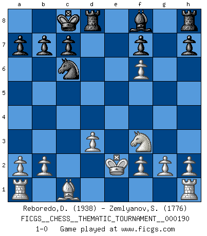 Last move : 1-0 2015 June 17 13:28:7 [Event "FICGS__CHESS__THEMATIC_TOURNAMENT__000190"] [Site "FICGS"] [Date "2015.04.02"] [Round "1"] [White "Reboredo,Daniel"] [Black "Zemlyanov,Sergey"] [Result "1-0"] [WhiteElo "1938"] [BlackElo "1776"] 1.e4 e6 2.d4 d5 3.Nc3 dxe4 4.Nxe4 e5 5.Nf3 Nf6 6.Nxf6+ gxf6 7.dxe5 Qxd1+ 8.Kxd1 Nc6 9.exf6 Bf5 10.Bd3 O-O-O 11.Ke2 Bxd3+ 12.cxd3 1-0 French : Rubinstein variation Queenside Castling by player Black (move 10) Player White won this chess game. Follow this game move after move (download)The most important feature of the Chess position is the activity of the pieces. This is absolutely fundamental in all phases of the game: Opening, Middlegame and especially Endgame. The primary constraint on a piece's activity is the Pawn structure. (Michael Stean) Ein Isolani verdüstert die Stimmung auf dem ganzen Schachbrett. (Savielly Grigorievitsch Tartakower) Sin errores no puede haber brillantez. (Emanuel Lasker) Le temps de noter son nom sur la feuille de partie, j'étais déjà en zeitnot ! D'un modeste amateur apparié lors de la première ronde d'un open contre le grand-maître Azmaïparashvili. Mandala - that's it! 16x16 squares as multiple of the four and the eight because of the Four Noble Truths and the Noble Eightfold Path. (Heinz-Georg Lehnhoff about Big Chess)