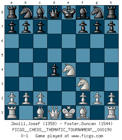 Last move : 0-1 2015 May 14 22:6:47 [Event "FICGS__CHESS__THEMATIC_TOURNAMENT__000190"] [Site "FICGS"] [Date "2015.04.02"] [Round "1"] [White "Zmolil,Josef"] [Black "Foster,Duncan"] [Result "0-1"] [WhiteElo "1358"] [BlackElo "1544"] 1.e4 e6 2.d4 d5 3.Nc3 dxe4 4.Nxe4 e5 5.Nf3 exd4 0-1 This chess game has been lost on time (started : 2015.04.02 15:19:13) French : Rubinstein variation Player Black won this chess game. Follow this game move after move (download)In Chess, at least, the brave inherit the earth. (Edmar Mednis) Ein unbeabsichtigtes Patt ist der Gipfel der Dummheit. (Anonymous) Cuando la partida de Ajedrez termina, el Peón y el Rey regresan a la misma caja. (Irish saying) Les sacrifices démontrent seulement que quelqu'un a gaffé. (Savielly Tartacover) Those who make the worst use of their time are the first to complain of its brevity. (Jean de la Bruyere)