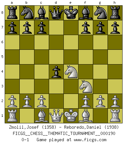 Last move : 0-1 2015 May 14 22:6:47 [Event "FICGS__CHESS__THEMATIC_TOURNAMENT__000190"] [Site "FICGS"] [Date "2015.04.02"] [Round "1"] [White "Zmolil,Josef"] [Black "Reboredo,Daniel"] [Result "0-1"] [WhiteElo "1358"] [BlackElo "1938"] 1.e4 e6 2.d4 d5 3.Nc3 dxe4 4.Nxe4 e5 5.Nf3 exd4 0-1 This chess game has been lost on time (started : 2015.04.02 15:19:13) French : Rubinstein variation Player Black won this chess game. Follow this game move after move (download)War is the child of passion, passion is the child of narcissism and narcissism is the child. (...) Another game ? (Thibault de Vassal) Meine Liebe ist Schach, Schach, Schach. Ich muss jeden Tag Schach spielen, deshalb fühle ich mich so stark. (Miguel Najdorf) Sin errores no puede haber brillantez. (Emanuel Lasker) Pour se monter efficace, un Cavalier a besoin d'avant-postes ! Les Cavaliers font les meilleurs bloqueurs de pions passés. The next best thing to gambling and winning is gambling and loosing. (Nick Dandalos)