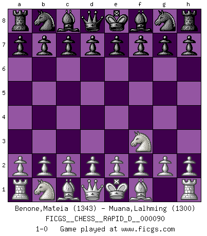 Last move : 1-0 2015 May 6 21:27:49 [Event "FICGS__CHESS__RAPID_D__000090"] [Site "FICGS"] [Date "2015.04.06"] [Round "1"] [White "Benone,Mateia"] [Black "Muana,Lalhming"] [Result "1-0"] [WhiteElo "1343"] [BlackElo "1300"] 1.Nf3 1-0 This chess game has been lost on time (started : 2015.04.06 16:19:2) Reti Opening Player White won this chess game. Follow this game move after move (download)The winner of the game is the player who makes the next-to-last mistake. (Savielly Tartakover) Wie gewinnt Tal? Er entwickelt alle seine Figuren in die Brettmitte und opfert sie dann irgendwo. (Robert James Fischer) La táctica fluye a partir de una posición superior. (Bobby Fischer) Les Cavaliers se révèlent fort utiles dans les positions fermées. D'habitude, les Fous sont un peu plus forts que les Cavaliers dans les positions ouvertes. Qu'on le veuille ou non, il restera toujours des exceptions ! We cannot be sure of having something to live for unless we are willing to die for it. (Ernesto Che Guevara)