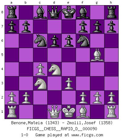 Last move : 1-0 2015 June 3 20:29:39 [Event "FICGS__CHESS__RAPID_D__000090"] [Site "FICGS"] [Date "2015.04.06"] [Round "1"] [White "Benone,Mateia"] [Black "Zmolil,Josef"] [Result "1-0"] [WhiteElo "1343"] [BlackElo "1358"] 1.Nf3 Nf6 2.c4 c5 3.Nc3 Nc6 4.d4 cxd4 5.Nxd4 d6 6.Bg5 e6 7.e3 1-0 Reti Opening Player White won this chess game. Follow this game move after move (download)I love all positions. Give me a difficult positional game, I will play it. But totally won positions, I cannot stand them. (Hein Donner) Schach ist gnadenlos. Du mußt bereit sein zu töten. (Nigel Short) La captura del Rey enemigo es la finalidad pero no el primer objetivo de la partida. (William Steinitz) Il vaut toujours mieux jouer un plan faux de façon logique que de n'avoir pas de plan du tout. (Victor Kortchnoï) Humor is by far the most significant activity of the human brain. (Edward De Bono)