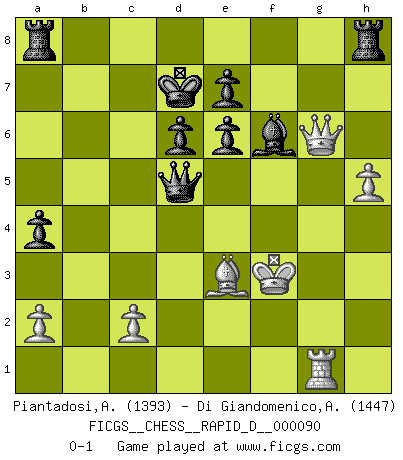 Last move : 0-1 2015 May 29 13:54:9 [Event "FICGS__CHESS__RAPID_D__000090"] [Site "FICGS"] [Date "2015.04.06"] [Round "1"] [White "Piantadosi,Angelo"] [Black "Di Giandomenico,Alfonso"] [Result "0-1"] [WhiteElo "1393"] [BlackElo "1447"] 1.e4 c5 2.Nf3 d6 3.d4 cxd4 4.Nxd4 Nf6 5.Nc3 g6 6.Be3 Bg7 7.f3 a6 8.Bc4 Nbd7 9.Qd2 b5 10.Bb3 Bb7 11.O-O-O Nc5 12.g4 Nxb3+ 13.Nxb3 b4 14.Ne2 a5 15.h4 h5 16.Nf4 a4 17.Nd4 hxg4 18.fxg4 Bxe4 19.Nc6 Bxc6 20.Qxb4 Bxh1 21.Rxh1 Nxg4 22.Ne6 fxe6 23.Qxg4 Kd7 24.Qxg6 Bf6 25.h5 Qb8 26.Rg1 Qxb2+ 27.Kd2 Qc3+ 28.Ke2 Qc4+ 29.Kf3 Qd5+ 0-1 Sicilian : Dragon, Yugoslav attack Queenside Castling by player White (move 11) Player Black won this chess game. Follow this game move after move (download)A great player and a great example for many. His book My 60 Memorable Games had a big impact on me. It is a shame he didn't continue to enrich the world of chess with his unparalleled understanding after 1972. (Jan Timman, about Bobby Fischer's death) Warum muß ich gegen diesen IDIOTEN verlieren? (Aaron Nimzowitsch) El Ajedrez te enseña a controlarl la excitación inicial que sientes cuando vez algo que parece bueno y te enseña a pensar objetivamente cuando te encuentras en problemas. (Stanley Kubrick) On entre au jeu d'Echecs comme on entre en Religion. Pour le joueur d'Echecs, la partie d'Echecs c'est l'office, la messe, le défilé du 1er Mai, le dépôt de gerbe au Monument aux Morts. C'est un drame sacré. (Michel Roos) Vladimir Ras-Putin is still alive... He is also a good actor, I saw him in the Lord of the Rings. (Rodolfo d'Ettorre)