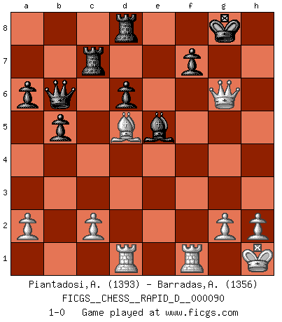 Last move : 1-0 2015 May 23 4:52:23 [Event "FICGS__CHESS__RAPID_D__000090"] [Site "FICGS"] [Date "2015.04.06"] [Round "1"] [White "Piantadosi,Angelo"] [Black "Barradas,Anderson"] [Result "1-0"] [WhiteElo "1393"] [BlackElo "1356"] 1.e4 c5 2.Nf3 d6 3.d4 cxd4 4.Nxd4 a6 5.Nc3 Nf6 6.Be2 e5 7.Nb3 Be7 8.O-O O-O 9.Be3 Nbd7 10.f4 b5 11.Bf3 Bb7 12.Nd5 Bxd5 13.exd5 e4 14.Be2 Nb6 15.Bxb6 Qxb6+ 16.Kh1 Rac8 17.Nd4 Rfe8 18.Nc6 Nxd5 19.Qxd5 Rxc6 20.Qxe4 g6 21.Qd3 Bf6 22.Bf3 Rc7 23.Rad1 Rd8 24.f5 Bxb2 25.fxg6 hxg6 26.Bd5 Be5 27.Qxg6+ 1-0 Sicilian Kingside Castling by player White (move 8) Kingside Castling by player Black (move 8) Player White won this chess game. Follow this game move after move (download)Winning isn't everything... but losing is nothing. (Mednis) Die Neutralität betrachte ich als eine schwere Krankheit. (Viktor Kortschnoi) Diferente gente reacciona diferentemente en aceptar la derrota. (Bobby Fischer) Des combinaisons [dans le jeu d'échecs] pareilles à des mélodies. Je crois entendre pour ainsi dire la musique des coups... (Vladimir Nabokov) History is a gallery of pictures in which there are few originals and many copies. (Alexis de Tocqueville)