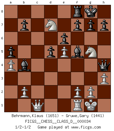 Last move : 1/2-1/2 2007 May 12 6:10:9 [Event "FICGS__CHESS__CLASS_D__000034"] [Site "FICGS"] [Date "2007.03.03"] [Round "1"] [White "Behrmann,Klaus"] [Black "Gruwe,Gary"] [Result "1/2-1/2"] [WhiteElo "1651"] [BlackElo "1441"] 1.e4 c6 2.d4 d5 3.e5 c5 4.c3 Nc6 5.Nf3 cxd4 6.cxd4 Bg4 7.Nbd2 e6 8.h3 Bf5 9.Be2 Ng8e7 10.O-O Qb6 11.Nb3 Nb4 12.Ne1 Rc8 13.Bd2 Nec6 14.Rc1 Rc7 15.a4 a5 16.Bb5 Be7 17.Bxb4 Bxb4 18.Nc5 O-O 19.Bxc6 Rxc6 20.Nd7 Rxc1 21.Qxc1 Qxd4 22.Nf3 Qe4 23.Ng5 Qh4 1/2-1/2 Caro-Kann : Advance variation Kingside Castling by player White (move 10) Kingside Castling by player Black (move 18) This chess game ended in a draw. Follow this game move after move (download)The passed Pawn is a criminal, who should be kept under lock and key. Mild measures, such as police surveillance, are not sufficient. (Aaron Nimzovich) Ein Isolani verdüstert die Stimmung auf dem ganzen Schachbrett. (Savielly Grigorievitsch Tartakower) Cuando veas una buena jugada, trata de encontrar otra mejor. (Emanuel Lasker) Vous n'êtes pas toujours obligé de jouer le meilleur coup. Un coup doit être actif, entreprenant, correct et beau ! (David Bronstein) Wawaweewa ! (Borat: Cultural learnings of America for make benefit glorious nation of Kazakhstan)