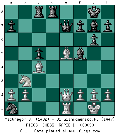 Last move : 0-1 2015 June 11 12:39:53 [Event "FICGS__CHESS__RAPID_D__000090"] [Site "FICGS"] [Date "2015.04.06"] [Round "1"] [White "MacGregor,Steven"] [Black "Di Giandomenico,Alfonso"] [Result "0-1"] [WhiteElo "1492"] [BlackElo "1447"] 1.d4 c5 2.d5 d6 3.c4 b5 4.e4 bxc4 5.Bxc4 g6 6.Nf3 Bg7 7.O-O Bg4 8.Qb3 Nd7 9.Nbd2 Ngf6 10.e5 Nxe5 11.Nxe5 dxe5 12.d6 O-O 13.dxe7 Qxe7 14.Qe3 Rfd8 15.Nb3 Rac8 16.Re1 Nd5 17.Qe4 Bf5 18.Qe2 Nb4 19.Bf4 Nc2 20.Bxe5 Nxa1 0-1 This chess game has been lost on time (started : 2015.04.06 16:19:2) Old Benoni defense Kingside Castling by player White (move 7) Kingside Castling by player Black (move 12) Player Black won this chess game. Follow this game move after move (download)Who is your opponent tonight, tonight I am playing against the Black pieces. (Akiba Rubinstein) Ich habe Putins Aufstieg an die Macht beobachtet und seine Politik, die demokratischen Institutionen meines Landes zu zerstören. (Garry Kasparov) El Ajedrez expande y enriquece tu mente. (Saudin Robovic) Le jeu d'échecs fait naître et fortifie en nous plusieurs qualités précieuses dans le cours de l'existence, telles que la prévoyance, la circonspection, la prudence, et la persévérance. (Benjamin Franklin - 1783, la morale des échecs) The intuitive mind is a sacred gift; the rational mind is a faithful servant. We have created a society that honors the servant but has forgotten the gift. (Albert Einstein)
