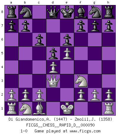 Last move : 1-0 2015 May 16 10:7:6 [Event "FICGS__CHESS__RAPID_D__000090"] [Site "FICGS"] [Date "2015.04.06"] [Round "1"] [White "Di Giandomenico,Alfonso"] [Black "Zmolil,Josef"] [Result "1-0"] [WhiteElo "1447"] [BlackElo "1358"] 1.e4 c6 2.d4 d5 3.e5 Bf5 4.Nf3 e6 5.Bd3 Bxd3 6.Qxd3 1-0 This chess game has been lost on time (started : 2015.04.06 16:19:2) Caro-Kann : Advance variation Player White won this chess game. Follow this game move after move (download)If your opponent offers you a draw, try to work out why he thinks he's worse off. (Nigel Short) Um sich vor der Gefahr einer Erkältung zu schützen, sorge der wanderlustige König beizeiten für ein brauchbares Versteck. (Aaron Nimzowitsch) El ganador de una partida es aquel jugador que hace el penúltimo error. (Savielly Tartakover) L'action d'une oeuvre littéraire se déroule sur un champ de bataille. Les masques et les types du drame moderne correspondent aux pièces du jeu d'échecs. L'intrigue correspond aux coups et aux gambits, c'est à dire aux techniques du jeu telles qu'utilisées et interprétées par les joueurs. Les tactiques et les péripéties [mouvements] correspondent aux coups exécutés par l'adversaire. (Viktor Shklovsky) All maxims have their antagonist maxims; proverbs should be sold in pairs, a single one being but a half truth. (William Mathews)