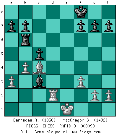 Last move : 0-1 2015 May 25 5:2:2 [Event "FICGS__CHESS__RAPID_D__000090"] [Site "FICGS"] [Date "2015.04.06"] [Round "1"] [White "Barradas,Anderson"] [Black "MacGregor,Steven"] [Result "0-1"] [WhiteElo "1356"] [BlackElo "1492"] 1.e4 e6 2.d4 d5 3.exd5 exd5 4.c4 c6 5.Nf3 Nf6 6.Bg5 Be7 7.Bxf6 Bxf6 8.Nc3 O-O 9.Be2 dxc4 10.Bxc4 Bg4 11.Be2 Bxf3 12.Bxf3 Re8+ 13.Be2 Qxd4 14.O-O Nd7 15.Re1 Nc5 16.Qxd4 Bxd4 17.Rac1 Ne4 18.Nxe4 Rxe4 19.Kf1 Rae8 20.Rc2 Rf4 21.f3 Rf6 22.Rd2 c5 23.Bc4 Rxe1+ 24.Kxe1 Kf8 25.a3 Rb6 26.b4 Bc3 0-1 French : Exchange variation Kingside Castling by player Black (move 8) Kingside Castling by player White (move 14) Player Black won this chess game. Follow this game move after move (download)A good sacrifice is one that is not necessarily sound but leaves your opponent dazed and confused. (Rudolph Spielmann) Bis jetzt ist Weiß einer wohlbekannten Analyse gefolgt. Aber jetzt begeht er einen schrecklichen Fehler: Er beginnt seinen eigenen Kopf zu benutzen. (Siegbert Tarrasch) Al jugar al Ajedrez entonces, podemos aprender: Primero: Previsión... Segundo: Prudencia... Tercero: Cautela... Y al final, aprendemos del Ajedrez el hábito de no ser desanimados por apariencias malas presentes en el estado de nuestros asuntos, el hábito de la esperanza por una oportunidad favorable y la perseveración de los secretos de los recursos. (Benjamin Franklin) Pour se monter efficace, un Cavalier a besoin d'avant-postes ! Les Cavaliers font les meilleurs bloqueurs de pions passés. There's no money in correspondence chess. (John Knudsen)