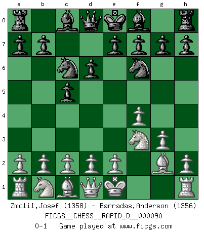 Last move : 0-1 2015 May 14 22:6:47 [Event "FICGS__CHESS__RAPID_D__000090"] [Site "FICGS"] [Date "2015.04.06"] [Round "1"] [White "Zmolil,Josef"] [Black "Barradas,Anderson"] [Result "0-1"] [WhiteElo "1358"] [BlackElo "1356"] 1.f4 Nf6 2.Nf3 c5 3.g3 d6 4.Bg2 Nc6 0-1 This chess game has been lost on time (started : 2015.04.06 16:19:2) Bird's Opening Player Black won this chess game. Follow this game move after move (download)Chess is a foolish expedient for making idle people believe they are doing something very clever when they are only wasting their time. (George Bernard Shaw) Schach ist das schnellste Spiel der Welt, weil man in jeder Sekunde Tausende von Gedanken ordnen muß. (Albert Einstein) Tu puedes aprender mucho mas de una partida que pierdas que de una partida ganada. Tendras que perder cientos de partidas antes de llegar a ser un buen jugador. (Jose Raul Capablanca) La vie et les Echecs sont tous les deux une lutte constante. (Lasker) May the force be with you. (Han Solo in Star Wars ep.4)