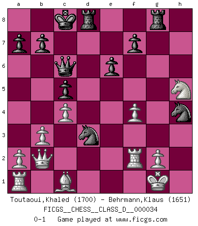 Last move : 0-1 2007 August 3 13:56:22 [Event "FICGS__CHESS__CLASS_D__000034"] [Site "FICGS"] [Date "2007.03.03"] [Round "1"] [White "Toutaoui,Khaled"] [Black "Behrmann,Klaus"] [Result "0-1"] [WhiteElo "1700"] [BlackElo "1651"] 1.e4 c6 2.d4 d5 3.Nc3 dxe4 4.Nxe4 Bf5 5.Ng3 Bg6 6.Nf3 e6 7.Be2 Bd6 8.Ne5 Bxe5 9.dxe5 Nd7 10.f4 Qb6 11.Qd2 Ne7 12.c4 h5 13.h4 c5 14.b3 Nc6 15.Bd3 O-O-O 16.Bxg6 Ndxe5 17.Qc3 Nxg6 18.Qxg7 Rhg8 19.Qb2 Nb4 20.O-O Nxh4 21.Nxh5 Qc6 22.Rf2 Nd3 0-1 This chess game has been lost on time (started : 2007.03.03 17:51:14) Caro-Kann : Classical variation Queenside Castling by player Black (move 15) Kingside Castling by player White (move 20) Player Black won this chess game. Follow this game move after move (download)We must make sure that Chess will not be like a dead language, very interesting, but for a very small group. (Sytze Faber) Sie bekommen vielleicht den Eindruck, dass die Spitzenspieler überhaupt gar nicht so stark sind. Aber das stimmt nicht. Es ist eine Illusion. Mit einem Computer an der Seite ist es sehr leicht, Urteile zu fällen, aber wenn man alleine am Brett sitzt, sieht die Sache ganz anders aus. (Vladimir Kramnik) Puntos débiles o agujeros en la posición de tu oponente deben de ser ocupados por piezas, no Peones. (Siegbert Tarrasch) Mais n'est-ce pas déjà le limiter injurieusement que d'appeler les échecs un jeu? N'est-ce pas aussi une science, un art, ou quelque chose qui, comme le cercueil de Mahomet entre ciel et terre, est suspendu entre l'un et l'autre, et qui réunit un nombre incroyable de contraires ? (Stefan Zweig) The bottom line is always the bottom line. (Johann Piek)