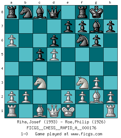 Last move : 1-0 2015 May 25 23:14:44 [Event "FICGS__CHESS__RAPID_A__000176"] [Site "FICGS"] [Date "2015.04.12"] [Round "1"] [White "Riha,Josef"] [Black "Roe,Philip"] [Result "1-0"] [WhiteElo "1993"] [BlackElo "1926"] 1.d4 g6 2.c4 Bg7 3.g3 d6 4.Nf3 c5 5.d5 b5 6.cxb5 a6 7.bxa6 Nf6 8.Bg2 O-O 9.Nc3 1-0 This chess game has been lost on time (started : 2015.04.12 6:25:16) Modern defense Kingside Castling by player Black (move 8) Player White won this chess game. Follow this game move after move (download)When your house is on fire, you can't be bothered with the neighbors. Or, as we say in Chess, if your King is under attack you don't worry about losing a Pawn on the Queen's side. (Gary Kasparov) Ich trinke, ich rauche, ich spiele, ich liebe Frauen aber Fernschach ist ein Laster, das ich nicht habe. (Mikhail Nekhemyevich Tal) El Peón aislado arroja penumbra sobre todo el tablero. (Aaron Nimzovich) En blitz, le Cavalier l'emporte sur le Fou. (Vlastimil Hort) . 'gn is not allowed in chess unless n is an integer between 1 and 8 inclusive, where 1 and 8 are to interpreted as the standard numerals standing for integers in the ordered real-closed field R, with the *canonical* ordering. (As opposed to, say, an integer in the domain Z[2+i*sqrt(5)] or an integer in some exotic Grothendieck topos). (Normajean Yates)