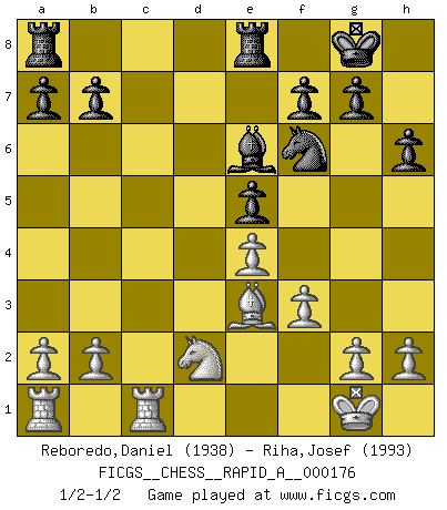 Last move : 1/2-1/2 2015 April 30 17:22:41 [Event "FICGS__CHESS__RAPID_A__000176"] [Site "FICGS"] [Date "2015.04.12"] [Round "1"] [White "Reboredo,Daniel"] [Black "Riha,Josef"] [Result "1/2-1/2"] [WhiteElo "1938"] [BlackElo "1993"] 1.c3 Nf6 2.d4 c5 3.Nf3 e6 4.Bf4 d5 5.e3 Nc6 6.Nbd2 Bd6 7.dxc5 Bxc5 8.Bd3 O-O 9.O-O Re8 10.e4 e5 11.Bg5 d4 12.cxd4 Bxd4 13.Nxd4 Nxd4 14.Nb3 Bg4 15.Qd2 h6 16.Be3 Ne2+ 17.Bxe2 Qxd2 18.Nxd2 Bxe2 19.Rfe1 Bg4 20.f3 Be6 21.Rec1 1/2-1/2 Saragossa Opening Kingside Castling by player Black (move 8) Kingside Castling by player White (move 9) This chess game ended in a draw. Follow this game move after move (download)It is no time to be playing Chess when the house is on fire. (Italian Proverb) Schach ist Krieg, im Schach geht es um testosterongesteuerte Urschreie. (Garry Kasparov) Yo he agregado estos principios a la ley: pongan los Caballos en acción antes de que los dos Alfiles sean desarrollados. (Emanuel Lasker) Ce n'est pas pour s'amuser qu'il joue aux échecs : il célèbre un culte. (Vladimir Nabokov) At last I discovered the true beauty of chess. So I proposed to her. (Dinesh De Silva)