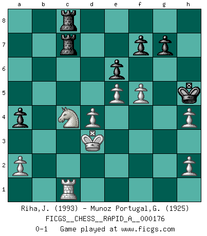 Last move : 0-1 2015 May 28 10:31:1 [Event "FICGS__CHESS__RAPID_A__000176"] [Site "FICGS"] [Date "2015.04.12"] [Round "1"] [White "Riha,Josef"] [Black "Munoz Portugal,Guillermo"] [Result "0-1"] [WhiteElo "1993"] [BlackElo "1925"] 1.e4 c5 2.Nf3 d6 3.d4 cxd4 4.Nxd4 Nc6 5.Nc3 Nf6 6.Bg5 e6 7.Qd2 Be7 8.O-O-O O-O 9.Nb3 b6 10.Bxf6 Bxf6 11.Qxd6 Bb7 12.Qxd8 Raxd8 13.Be2 Nd4 14.Nxd4 Bxd4 15.f3 h5 16.g3 Be5 17.Nb5 a6 18.Na3 h4 19.Nc4 Bc7 20.gxh4 b5 21.Nd2 Bf4 22.c3 b4 23.Kc2 bxc3 24.bxc3 Bc6 25.Nb3 Ra8 26.Rd4 Be3 27.Rb4 a5 28.Rd4 a4 29.Kd3 Bf2 30.Nd2 Bxd4 31.cxd4 Bb5 32.Ke3 Bxe2 33.Kxe2 Rac8 34.Kd3 Rc7 35.Nc4 Rd8 36.e5 Rdc8 37.Rc1 Kh7 38.f4 Kh6 39.f5 Kh5 0-1 Sicilian Queenside Castling by player White (move 8) Kingside Castling by player Black (move 8) Player Black won this chess game. Follow this game move after move (download)Do you realize Fischer almost never has any bad pieces? He exchanges them, and the bad pieces remain with his opponents. (Yuri Balashov) Ich bin der einzige Schachspieler, der sich während der Vorbereitungen zum Turnier verletzt hat. (Woody Allen) Cuando veas una buena jugada, trata de encontrar otra mejor. (Emanuel Lasker) Le succès, c'est être capable d'aller d'échec en échec sans perdre son enthousiasme. (Winston Churchill) Art disturbs, science reassures. (Georges Braque, Le Jour et la Nuit)