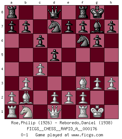 Last move : 0-1 2015 June 1 11:48:1 [Event "FICGS__CHESS__RAPID_A__000176"] [Site "FICGS"] [Date "2015.04.12"] [Round "1"] [White "Roe,Philip"] [Black "Reboredo,Daniel"] [Result "0-1"] [WhiteElo "1926"] [BlackElo "1938"] 1.c4 Nf6 2.g3 c6 3.Bg2 d5 4.Nf3 g6 5.b3 Bg7 6.Bb2 O-O 7.O-O Bg4 8.h3 Bxf3 9.Bxf3 Nbd7 0-1 This chess game has been lost on time (started : 2015.04.12 6:25:16) English, 1...Nf6 (Anglo-Indian defense) Kingside Castling by player Black (move 6) Kingside Castling by player White (move 7) Player Black won this chess game. Follow this game move after move (download)Fischer sacrificed virtually everything most of us weakies (to use his term) value, respect, and cherish, for the sake of an artful, often beautiful board game, for the ambivalent privilege of being its greatest master. (Paul Kollar) Der Bart als Geschlechtszeichen mitten im Gesicht ist obszön. Daher gefällt er den Weibern. [Zugegeben, kein Schachzitat, aber unglaublich originell] (Arthur Schopenhauer) Me dio la sensación de como si yo estuviera jugando en contra del mismo Ajedrez. - al estar jugando en contra de Robert Fischer (Walter Shipman) Avec des compensations pour le matériel en plus... (Anonyme) No, I am still playing. (Anatoly Karpov)