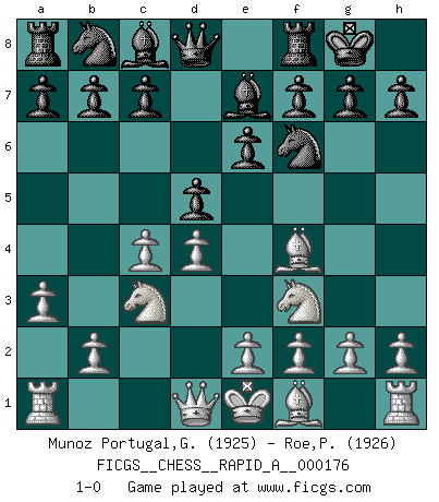 Last move : 1-0 2015 May 28 23:28:39 [Event "FICGS__CHESS__RAPID_A__000176"] [Site "FICGS"] [Date "2015.04.12"] [Round "1"] [White "Munoz Portugal,Guillermo"] [Black "Roe,Philip"] [Result "1-0"] [WhiteElo "1925"] [BlackElo "1926"] 1.d4 d5 2.c4 e6 3.Nf3 Nf6 4.Nc3 Be7 5.Bf4 O-O 6.a3 1-0 This chess game has been lost on time (started : 2015.04.12 6:25:16) Queen's gambit declined Kingside Castling by player Black (move 5) Player White won this chess game. Follow this game move after move (download)It is not a move, even the best move that you must seek, but a realizable plan. (Eugene Znosko-Borovsky) Ich bin stolz ein Bulgare zu sein. (Veselin Topalov) Todos los Maestros de Ajedrez fueron un día unos principiantes. (Chernev) Aidez vos pièces, elles vous aideront. (Paul Morphy) Programmer - an organism that turns coffee into software. (Anonymous)