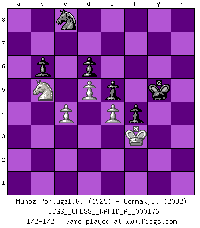 Last move : 1/2-1/2 2015 July 2 19:35:9 [Event "FICGS__CHESS__RAPID_A__000176"] [Site "FICGS"] [Date "2015.04.12"] [Round "1"] [White "Munoz Portugal,Guillermo"] [Black "Cermak,Jan"] [Result "1/2-1/2"] [WhiteElo "1925"] [BlackElo "2092"] 1.d4 Nf6 2.c4 g6 3.Nc3 Bg7 4.e4 d6 5.Be2 O-O 6.Nf3 e5 7.O-O Nc6 8.d5 Ne7 9.Be3 Ng4 10.Bd2 f5 11.Ng5 Nf6 12.f3 c6 13.Be3 Bh6 14.h4 f4 15.Bf2 c5 16.Qd2 Bd7 17.Rfb1 a5 18.a3 Bxg5 19.hxg5 Nh5 20.b4 axb4 21.axb4 Rxa1 22.Rxa1 cxb4 23.Na2 b3 24.Nc3 b6 25.Bd1 Nc8 26.Bxb3 Qxg5 27.Ba4 Bxa4 28.Rxa4 Qh6 29.g4 Nf6 30.Be1 g5 31.Qc2 Qg7 32.Qg2 h5 33.gxh5 Kh7 34.Kf1 g4 35.Bh4 Rg8 36.Bxf6 Qxf6 37.fxg4 Qh4 38.Ra2 Rxg4 39.Qh2 Qg5 40.Rg2 Rxg2 41.Qxg2 Qxg2+ 42.Kxg2 Kh6 43.Kf3 Kxh5 44.Nb5 Kg5 1/2-1/2 King's Indian : 5.Be2 Kingside Castling by player Black (move 5) Kingside Castling by player White (move 7) This chess game ended in a draw. Follow this game move after move (download)Chess demands total concentration. (Bobby Fischer) Ich kenne Menschen, die allen Willen der Welt besitzen und doch nicht Schach spielen können. (Robert James Fischer) Una partida de Ajedrez se divide en 3 etapas: la primera cuando piensas que tienes la ventaja, la segunda cuando crees que tienes la ventaja y la tercera... ¡cuando te das cuenta que vas a perder!. (Savielly Tartakower) Karpov est une pièce de musée. (Garry Kasparov) When the going gets tactical, the computers get going. (Hyatt)