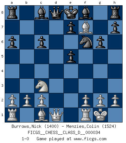 Last move : 1-0 2007 March 11 1:46:31 [Event "FICGS__CHESS__CLASS_D__000034"] [Site "FICGS"] [Date "2007.03.03"] [Round "1"] [White "Burrows,Nick"] [Black "Menzies,Colin"] [Result "1-0"] [WhiteElo "1400"] [BlackElo "1524"] 1.e4 c5 2.Nf3 Nc6 3.d4 cxd4 4.Nxd4 d6 5.Nc3 a6 6.Nxc6 bxc6 7.Bc4 Nf6 8.O-O g6 9.e5 dxe5 10.Bxf7+ 1-0 Sicilian defense Kingside Castling by player White (move 8) Player White won this chess game. Follow this game move after move (download)Chess is a terrible game. If you have no center, your opponent has a freer position. If you do have a center, then you really have something to worry about ! (Siegbert Tarrasch) Kein Großmeister ist normal. Sie unterscheiden sich nur im Ausmaß Ihrer Verrücktheit. (Viktor Kortschnoi) La táctica fluye a partir de una posición superior. (Bobby Fischer) Les écrivains ont utilisé les échecs pour analyser les côtés extrêmes de la nature humaine. Dans ce cadre, les échecs offrent un champ d'expérimentation idéal. Mais on pourrait faire la même chose avec la peinture. Et là, en vous référant à Van Gogh, vous ne tirerez pas de conclusion définitive sur les peintres. (Gary Kasparov) It is not enough to be a good player... you must also play well. (Siegbert Tarrasch)