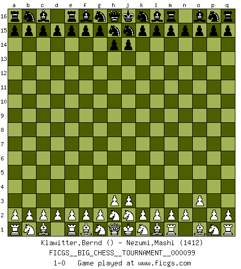 Last move : 1-0 2015 May 13 9:58:23 [Event "FICGS__BIG_CHESS__TOURNAMENT__000099"] [Site "FICGS"] [Date "2015.04.12"] [Round "1"] [White "Klawitter,Bernd"] [Black "Nezumi,Mashi"] [Result "1-0"] [WhiteElo ""] [BlackElo "1412"] 1.o2-o3 1-0 This big chess game has been lost on time (started : 2015.04.12 18:32:53) Follow this game move after move (download)An attack on the wing should be met by play in the center. (Nimzovitch) Frage: Was machen Sie mit den Preisen? Anwort: Ich habe Angst, dass meine Freundin davon neue Kleider kauft. (Loek van Wely) Debió haber existido una vez en que los hombres eran semidióses, de otra manera no hubiesen podido inventar el Ajedrez. (Gustav Schenk) Je fais ceci parce que dans cinquante coups j'obtiendrai cela; je m'appelle Mikhail Moisevitch Botvinnik. (Botvinnik) I live to kill Traxler counterattack. (Ilmars Cirulis)