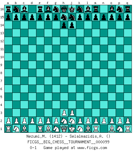 Last move : 0-1 2015 May 12 21:57:34 [Event "FICGS__BIG_CHESS__TOURNAMENT__000099"] [Site "FICGS"] [Date "2015.04.12"] [Round "1"] [White "Nezumi,Mashi"] [Black "Selalmazidis,Arsenis"] [Result "0-1"] [WhiteElo "1412"] [BlackElo ""] 0-1 This big chess game has been lost on time (started : 2015.04.12 18:32:53) Follow this game move after move (download)Fischer, who may or may not be mad as a hatter, has every right to be horrified. (Jeremy Silman) Darum geht es im Schach. Einen Tag gibst du deinem Gegner eine Lektion, am nächsten Tag gibt er dir eine. (Robert James Fischer) Fischer sacrificó virtualmente todo lo que la mayoría de nosotros los 'debiles' (término que él usa) valoramos, respetamos y apreciamos por el amor de un astuto, a menudo hermoso tablero de juego, por el privilegio ambivalente de ser su mas grande maestro. (Paul Kollar) A chaque perte on perd un peu de soi. (Joël Lautier) Political correctness is subjecting us to gross incompetence. (Johann Piek)