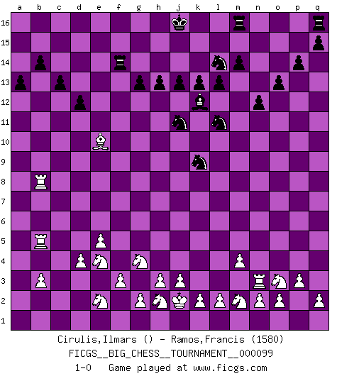 Last move : 1-0 2015 May 11 16:52:35 [Event "FICGS__BIG_CHESS__TOURNAMENT__000099"] [Site "FICGS"] [Date "2015.04.12"] [Round "1"] [White "Cirulis,Ilmars"] [Black "Ramos,Francis"] [Result "1-0"] [WhiteElo ""] [BlackElo "1580"] 1.j2-l3 p15-p14 2.h1-o7 o15-o13 3.o7-f15 g16-f14 4.f15-c12 c15-c14 5.d2-d3 o16-p15 6.c1-o12 m15-m14 7.c2-c3 d15-d13 8.c12-l4 l15-l13 9.e2-e4 n15-n13 10.o12-j7 e15-e13 11.f1-e2 n13-n12 12.p2-p3 b15-b14 13.m2-m3 c16-f13 14.e2-m9 h14-h13 15.e1-e3 p16-n15 16.e3-f3 f13-g12 17.l1-o4 b16-d15 18.o1-q3 h15-j13 19.b1-d2 k15-k13 20.q3-g12 j13-g12 21.l4-d11 e13-e12 22.d11-c10 c14-c13 23.a1-e1 h16-h15 24.m3-m4 l16-n14 25.m1-m3 n14-a2 26.b2-b3 e12-e11 27.c10-h15 k16-h15 28.e1-a1 p15-c3 29.a1-a2 n15-l14 30.g1-e2 c3-p15 31.p1-o3 g15-g13 32.k1-m2 f16-k12 33.j1-j2 d15-e13 34.d3-d4 h15-k14 35.q1-a1 a15-a13 36.o4-g11 j14-j13 37.f3-f5 f14-e12 38.g11-k8 j15-g14 39.f5-b5 e13-c12 40.m9-j6 e12-d10 41.l3-k5 d13-d12 42.e4-e5 e16-f16 43.f2-f3 g14-h12 44.m3-n3 a16-e16 45.k5-h6 k14-j12 46.d2-e4 h12-j10 47.k8-m10 p15-l11 48.m10-l11 j10-l11 49.h6-g4 l11-k9 50.j7-h6 f16-f14 51.a2-a6 e11-e10 52.a6-a10 j12-l11 53.h6-d10 c12-d10 54.a10-d10 k9-h8 55.d10-e10 e16-e10 56.j6-e10 g12-j11 57.a1-a8 h8-k9 58.a8-b8 1-0 Follow this game move after move (download)Though most people love to look at the games of the great attacking masters, some of the most successful players in history have been the quiet positional players. They slowly grind you down by taking away your space, tying up your pieces, and leaving you with virtually nothing to do ! (Yasser Seirawan) Frage des Reporters: -Welche besonderen Umstände rechtfertigen das Anhalten der Uhren während einer Turnierpartie? Antwort: -Einen Fotographen zu strangulieren. (Siegbert Tarrasch) Un jugador que es sorprendido, esta derrotado a medias. (Proverbio) Le succès, c'est être capable d'aller d'échec en échec sans perdre son enthousiasme. (Winston Churchill) You know what they say : You lie down with the Devil, you wake up in Hell. (Horatio Caine, C.S.I. Miami)